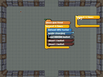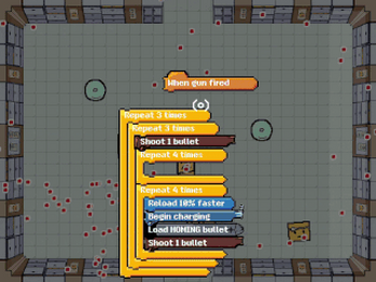 Now, you must fend for yourself against the various programs seeking to terminate you. McCoffee took your weapon too; It looks like you'll have to program a new one, using whatever blocks of code you can find. You'll need to use your skills in Scrap, the company's coding language, if you want to survive.